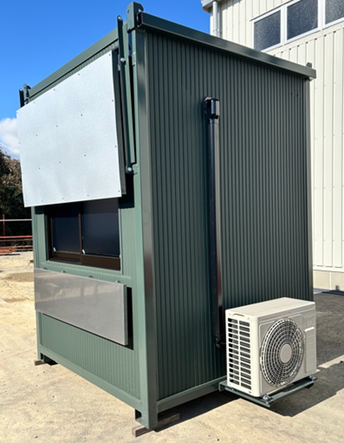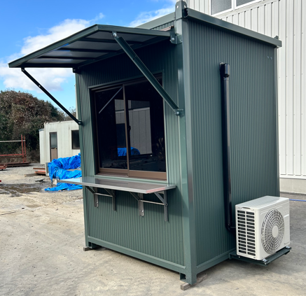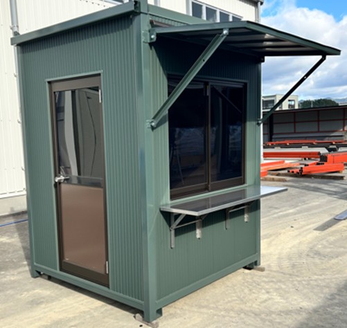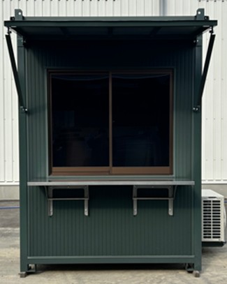 開閉式の庇(ひさし)とカウンターを備えたユニットハウスです。